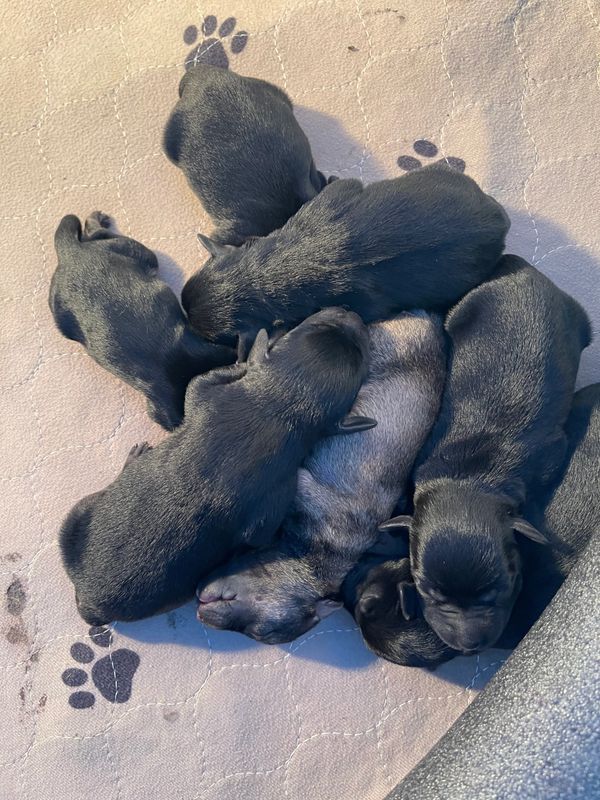 All of our puppies are born and raised in our home. We section off a portion of our living-room and add additional flooring to protect or floor from accidents. We add a 4‘ x 4’ whelping box on top of the flooring and once they are 4 -5 weeks old we add an additional play area for them to stretch out and play in.